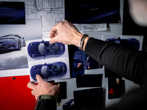 "From swatch to spray gun, Blusogno earned its passport to the production line on this studio wall. Credit: Porsche Italia / Ferragamo"