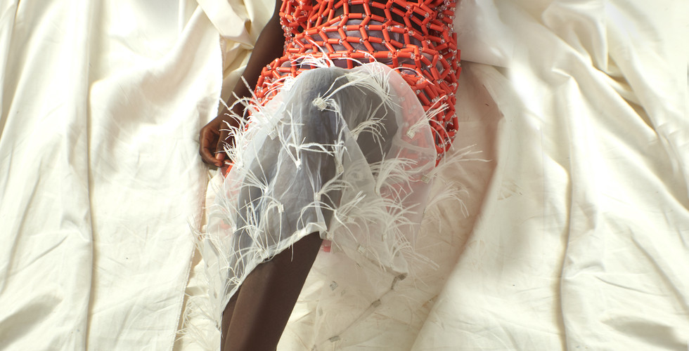 Some of the key elements of this collection come in the for of the powder blue to represent Water, green to represent the ikhimwin tree, feathers to represent the Owonwon, burgundy from the traditional burgundy coloured velvet wrappers tied by Bini women. These colours and their deeper meaning allow an incite into the thought process of each piece and the concepts in which they carry.