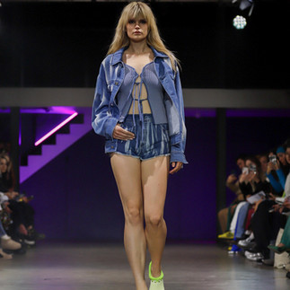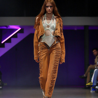 At the heart of this collection lies a daring reinterpretation of streetwear, with stone-washed denim reworked to perfection. Denim, a streetwear staple, is given new life through Fast’s eye for luxury. His treatment of this familiar fabric reflects a fresh edge that feels simultaneously tough and refined. The collection dances between elegance and attitude, most notably in his bandage dresses that come in a spectrum of soft neutrals and electric neons—whispers of sophistication punctuated by bold declarations of colour. The Stone Rose Crochet Dress emerges as a standout piece, with its daring fringing at the hips evoking a sense of musical movement. It’s a testament to Fast’s ability to merge intricate, delicate detailing with a fearless modernity.