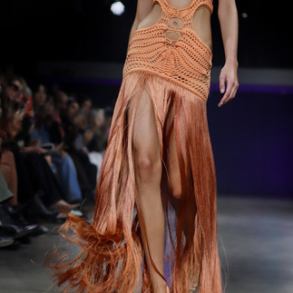 Knitwear, long a signature of Mark Fast, takes centre stage with renewed vigour this season. Known for his mastery over body-hugging designs, Fast's creations showcase an unparalleled blend of technique and creativity. His knit pieces are sculptural yet fluid, from the open-knit weaves that reveal delicate glimpses of skin to tightly contoured dresses that wrap around the body like second skin. There’s an unmistakable artistry at play here—traditional hand-knitting techniques are interwoven with cutting-edge technology to produce textures that challenge conventions and captivate the eye. The result? A collection that pushes the boundaries of what knitwear can be—both functional and fantastical.